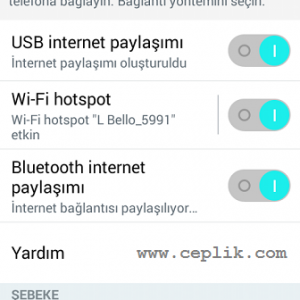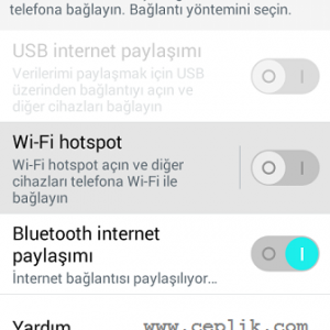İlgili seçeneklere kısaca değinmek gerekirse; ‘Wi-Fi hotspot’ ile telefonunuzu kablosuz bir modem dönüştürerek başka bir cihazın Wi-Fi özelliği sayesinde sizin cihazınıza bağlanmasını sağlarsınız. ‘UBS internet paylaşımı’ daha çok bilgisayarlar ile internet paylaşımı için tercih edilir ve data kablosu kullanmak gerekir. ‘Bluetooth internet paylaşımı’ ise akıllı telefondaki internetin Bluetooth ile paylaşılmasına olanak verir.