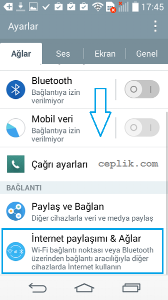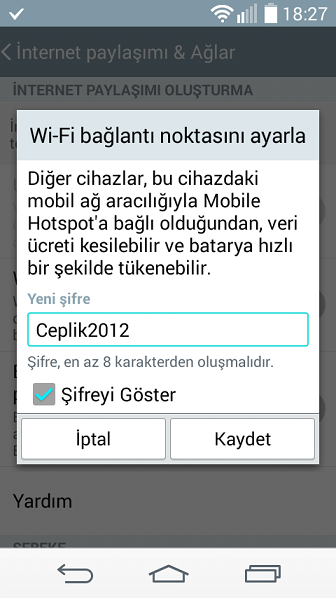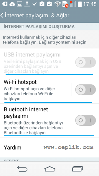 İlgili seçeneklere kısaca değinmek gerekirse; ‘Wi-Fi hotspot’ ile telefonunuzu kablosuz bir modem dönüştürerek başka bir cihazın Wi-Fi özelliği sayesinde sizin cihazınıza bağlanmasını sağlarsınız. ‘UBS internet paylaşımı’ daha çok bilgisayarlar ile internet paylaşımı için tercih edilir ve data kablosu kullanmak gerekir. ‘Bluetooth internet paylaşımı’ ise akıllı telefondaki internetin Bluetooth ile paylaşılmasına olanak verir.