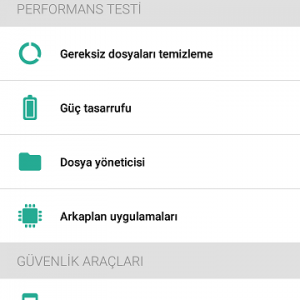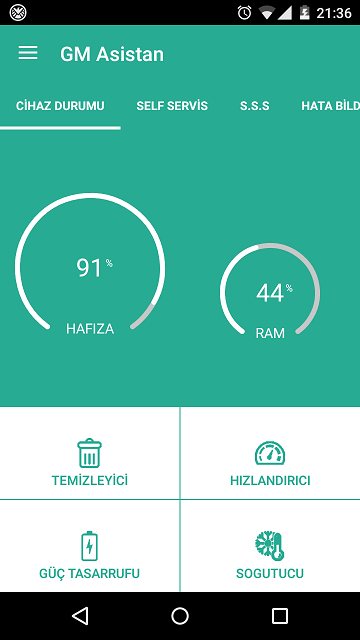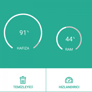 Cihaz durumu sekmesinde yani karşınıza çıkan ilk ekranda Temizleyici, Hızlandırıcı, Güç tasarrrufu ve Soğutucu seçenekleri mevcut. Temizleyici ile açmış olduğunuz uygulamaların ve oyunların önbelleğe attığı dosyaları temizleyip cihazın daha kararlı çalışmasını sağlayabilirsiniz. Yine Hızlandırıcı seçeneği ile de RAM hafızasını düşürüp cihazın performansını arttırabilirsiniz.
