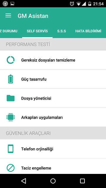 İkinci sekmede Self Servis var. Self servis bölümünde yapılan işlemler kullanıcın isteğine bırakılmıştır. Yani buradaki seçenekler manuel olarak uygulanabiliyor. Self Servis bölümünde Performans Testi, Güvenlik Araçları, Telefon Yönetimi ve Yazılım Yönetimi alt başlıkları mevcut.