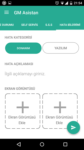 Uygulamanın arayüzü Cihaz Durumu, Self Servis, S.S.S ve Hata Bildirimi olmak üzere dört farklı bölüme ayrılmış. Ayrıca ekran üzerinde sağa doğru kaydırma yapıldığında da kullanıcı bilgilerine ulaşılabiliyor. Uygulamanın ilk iki bölümü cihazın durumuyla ilgili görüntülemeler ve çeşitli işlemler için kullanılıyor. Sıkça Sorulan Sorular bölümünde ise kullanıcıların merak edebileceği bir çok soru cevabıyla birlikte yer alıyor. Hata bildirimi kısmından ise cihazınızla ilgili yaşadığınız sorunları markaya geri bildirim göndererek iletebiliyorsunuz. Üstelik bu geri bildirime ekran görüntüsü de ekleyebilirsiniz. Geri bildirimlerin kontrol edildiğini de belirtelim. Biz yaptığımız geri bildirimlere cevap alabildik.